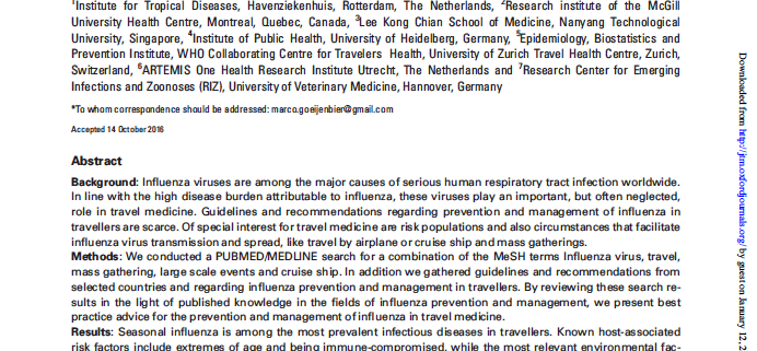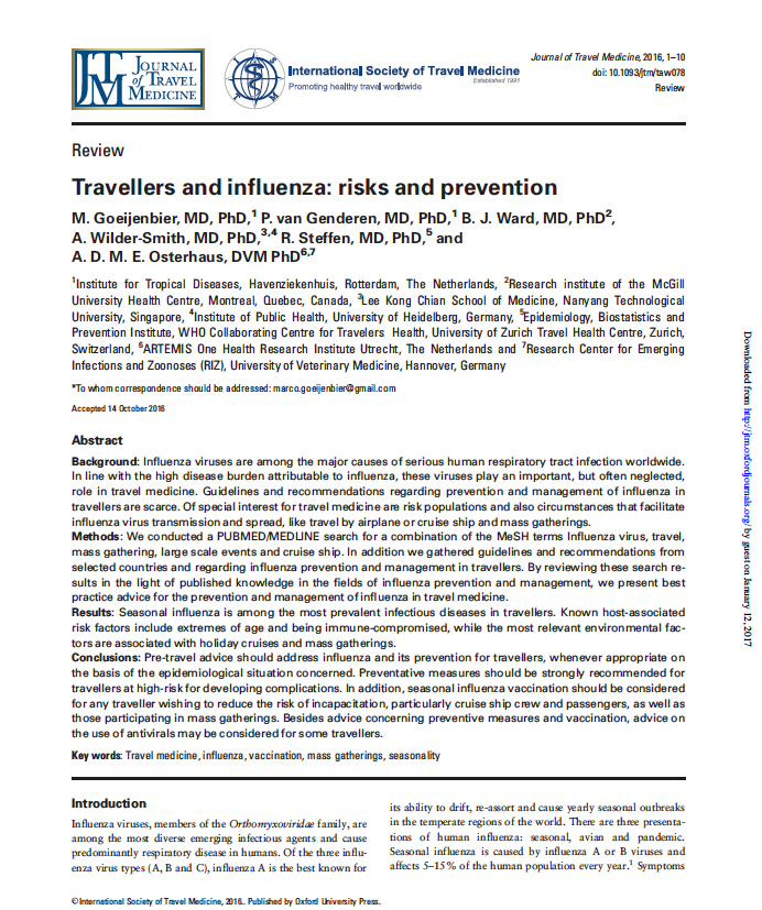 Seasonal influenza is the most frequent vaccine preventable infectious disease in travellers. Yet, surprisingly, recommendations regarding influenza in travel medicine are scarce. It is therefore high time to harmonize international and national travel medicine guidelines for influenza prevention and treatment. To that end, an expert group of ESWI and ISTM (International Society for Travel Medicine) have reviewed existing flu recommendations for travellers, and listed some interesting suggestions for improvement. Our joint working group has now published its expert opinion paper “Travellers and influenza: risks and prevention” in the Journal for Travel Medicine. Get the full article (pdf) here.