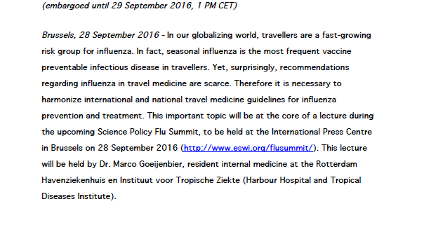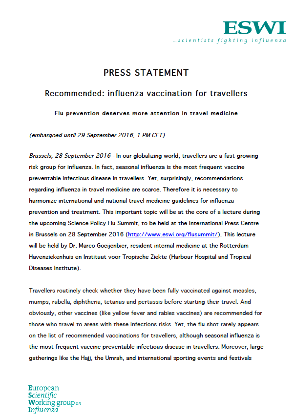ESWI has issued a press release to highlight the fact that flu prevention deserves more attention in travel medicine. This press statement is released at the occasion of Dr. Marco Goeijenbier’s lecture at the Science Policy Flu Summit, to be held at the International Press Centre in Brussels on 28 September 2016. Download the press release here.