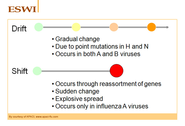 Influenza A viruses continuously undergo antigenic evolution. Since the viral surface glycoprotein HA is the antigen against which virus-neutralizing antibodies are directed, it is primarily the antigenic variation of HA that is responsible for the immune escape of influenza viruses. Two distinct mechanisms of antigenic evolution can be identified: antigenic drift causes regular influenza epidemics, while antigenic shift is the cause of occasional global outbreaks of influenza (pandemics). Antigenic drift is a gradual process and occurs as a result of the accumulation of point mutations in the epitopes of HA. Indeed, the replication of viral RNA is an error-prone process, leading to a mutation frequency of about one in 100,000 nucleotides. Considering that the size of the entire influenza virus genome is about 14,000 nucleotides, many new viral RNA genome copies will contain one or more mutations. Some of those may give rise to new virus variants with an advantage over the parent virus. Depending on the nature of the mutation, the new virus strain may still be partially recognized by the immune defence of the host. Thus, the severity of an epidemic is a subtle interplay between the waning immunity in the population, the extent of the antigenic drift and the virulence of the new virus variant.